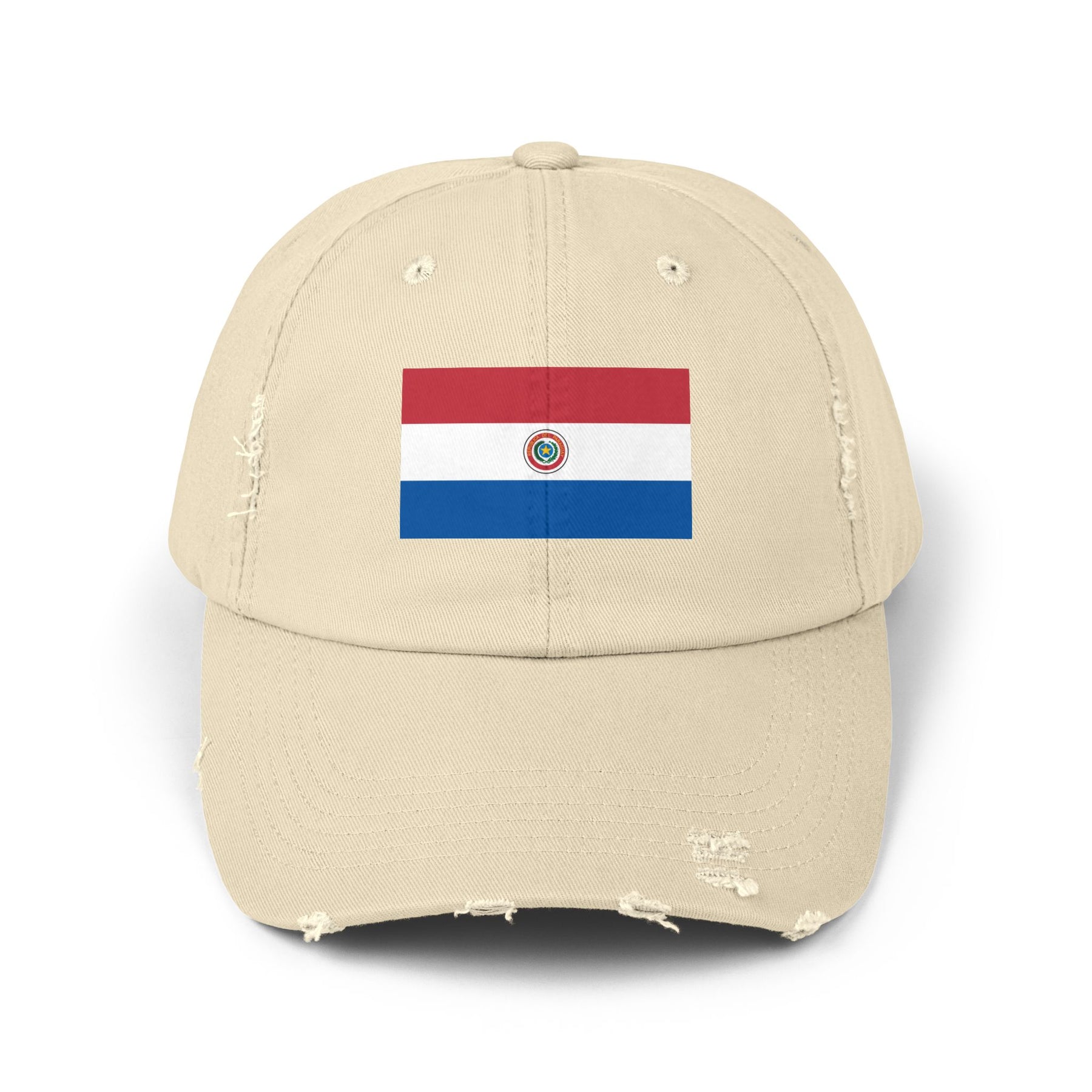 Embrace your adventurous spirit with this trendy distressed cap featuring a vibrant Paraguay flag design. Perfect for outdoor fun or casual outings, it adds a unique twist to any outfit.